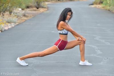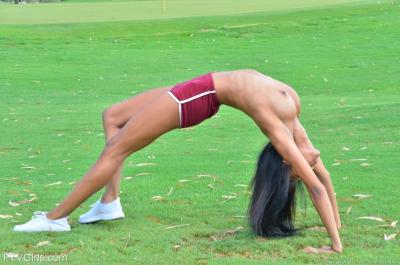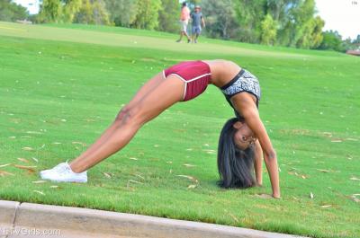 Разминаясь на асфальтированной дороге, озабоченная американка Nia Nicce занимает очень непристойные позы и при этом постоянно прикасается к интимным местам. Осмотревшись, молодая негритянка разделась и погладила твердые соски, которые замечательно торчали. Покрутив напряженной попкой, голенькая телка перебралась на газон. Заводная девушка без одежды показывала не только дырочки, но и большие сисечки, которые она нежно гладила и теребила.