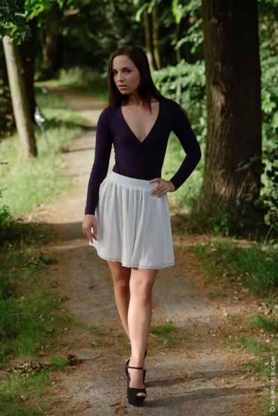 Надев эротичный купальник, черноволосая деваха подтянула короткую юбку и побрела гулять в лес. Вскоре милочка наткнулась на небольшое озеро. Одернув рыбака, горячая жительница Чехии начала возбуждать мужчину стриптизом. Через несколько минут девушка с привлекательной мордашкой уже шаловливо крутила голой попкой. Обнаженная Kristy Black была настолько прекрасна, что от ее внешнего вида у зрителя потекли слюни. Выйдя на мостик, эротичная телочка стала очень резво трясти булками. Наклонившись, раскрепощенная брюнетка с пирсингом на сосках и в пупке дала взглянуть на промежность и анальную дырочку.